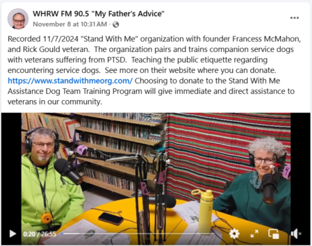 Here at STAND WITH ME, we train veteran/dog teams for service dog work. Our mission is to help veterans with a service-connected mental health disability, to train their own dogs to be their service dog. You may see us out and about in the Triple Cities public places, training dogs. You may see us during lessons, with a veteran and their dog taking instruction from the training instructor and her dog. Or, you might see one of our veteran/dog teams out in public, doing their practice homework on their own.